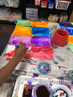 This lesson took three, fifty minute class periods. On the first day students folded a piece of 12" x 18" multi media paper into eight sections. On each box students used various watercolor methods to create textures. Salt, plastic wrap, vegetable oil resist, oil pastel resist, dry brush, wet on wet were just a few of the methods used. They had to rush to get this part finished. See my demonstration videos below.