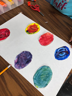 Some students did a great job of mixing their colors and staying into the appropriate oval, others got a little carried away and mixed a couple together. I wasn't to concerned since this was the first time many students had experienced finger painting. I wanted them to experience the excitement of discovering how to make the secondary colors but some experienced how to make brown instead!